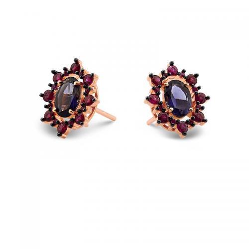 Brinco Máxima, confeccionado em ouro rosé 18k, iolita e rubis.